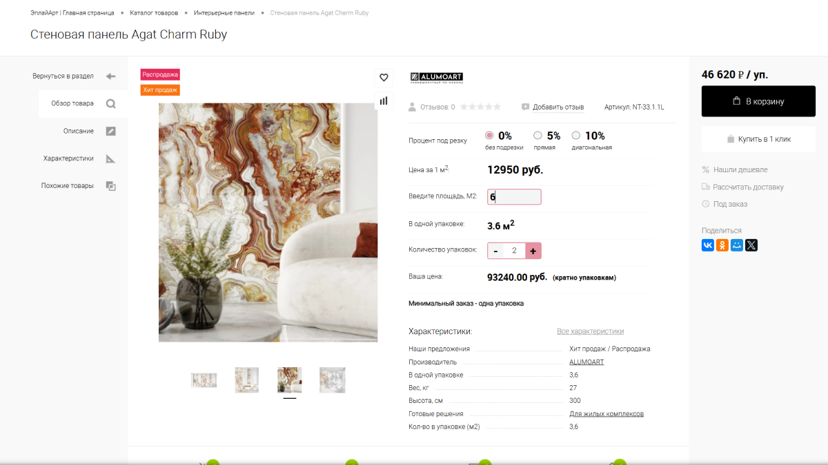 Главная фишка — умный калькулятор в карточке товара. Покупатель сразу рассчитывает нужное количество материала, видит стоимость и добавляет в корзину. Никаких лишних действий.