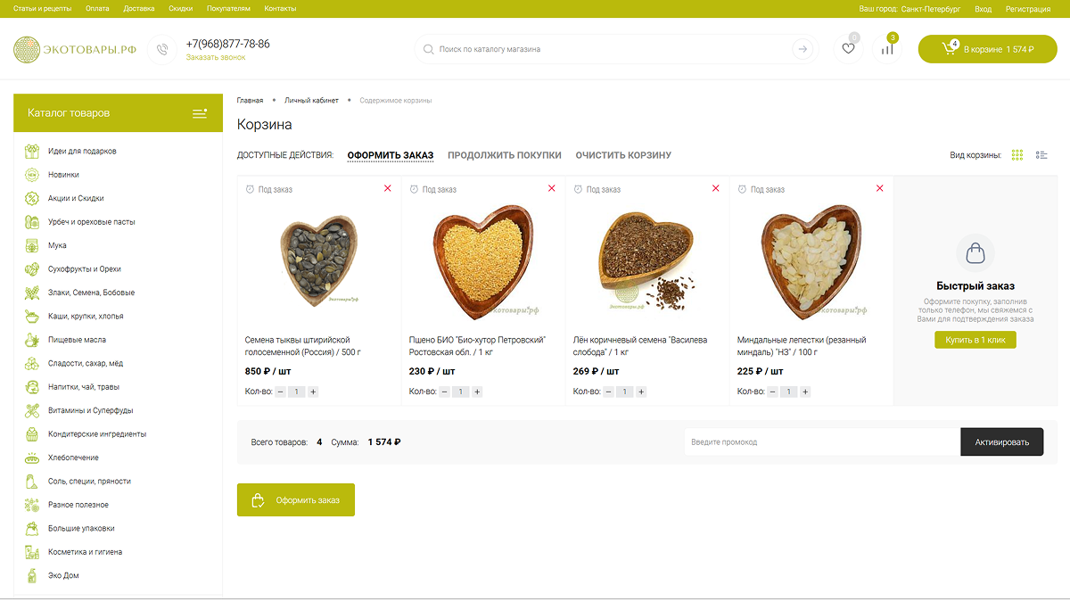 Обычно разработка интернет-магазина это долгое программирование каждой мелочи: фильтров, корзины, личного кабинета. С Deluxe иначе. Всё это уже есть в коробке. Нам оставалось только включить нужные функции и настроить их под задачи «Экотоваров». Быстро, чисто, без лишнего кода. Вот что получилось.