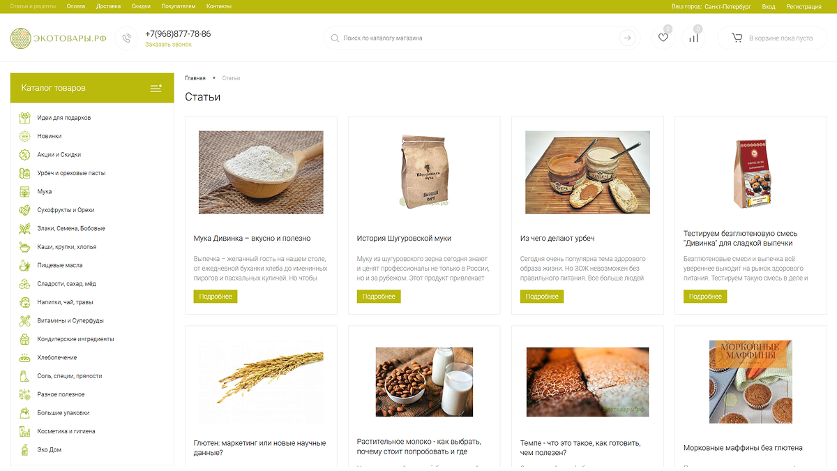 Наш дизайнер вместе с маркетологом. Оформили магазин специально под аудиторию, которая выбирает полезное питание. Чтобы выглядело свежо, чисто и аппетитно.