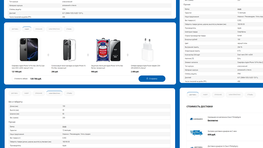 Карточка товара адаптируется под каждый продукт: динамичные вкладки автоматически появляются или исчезают в зависимости от содержимого. Для пользователя всегда доступны только актуальные данные – характеристики, торговые предложения, наборы, описание и другая информация, что делает процесс выбора простым и удобным.
