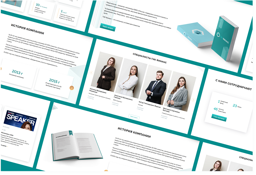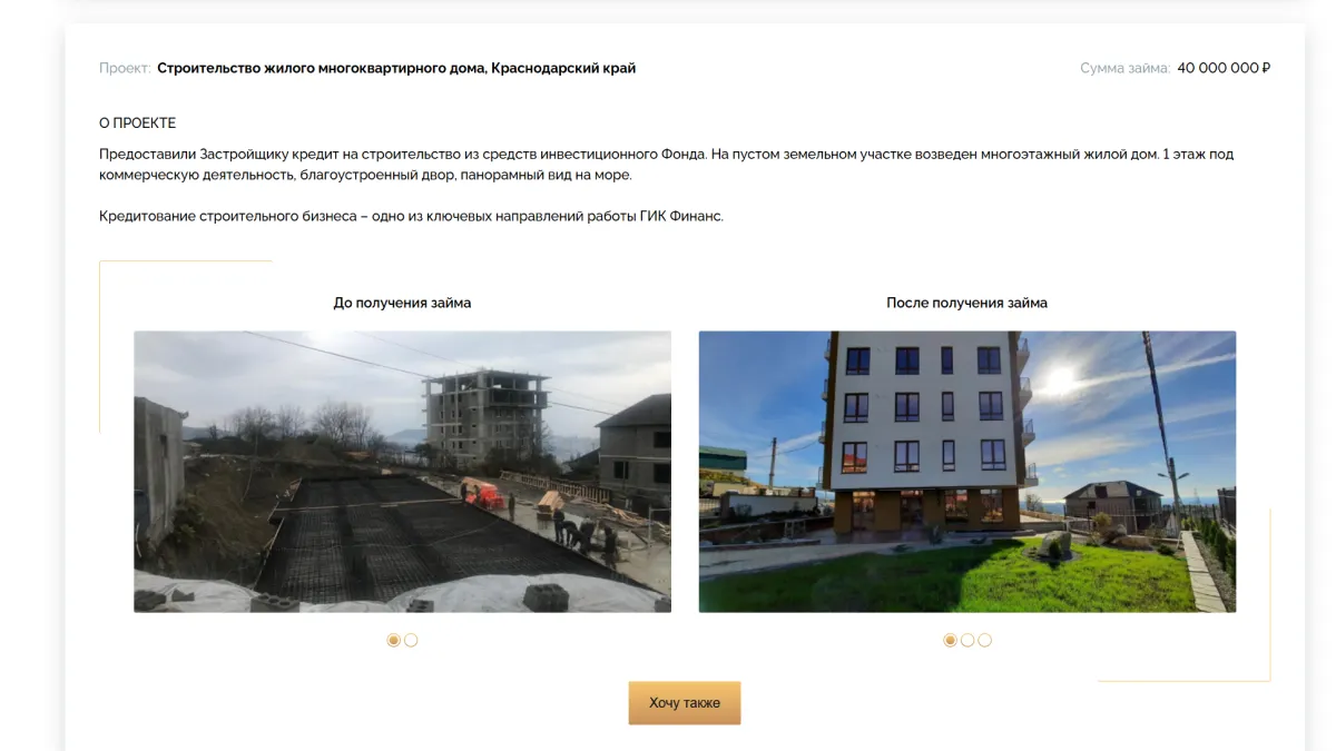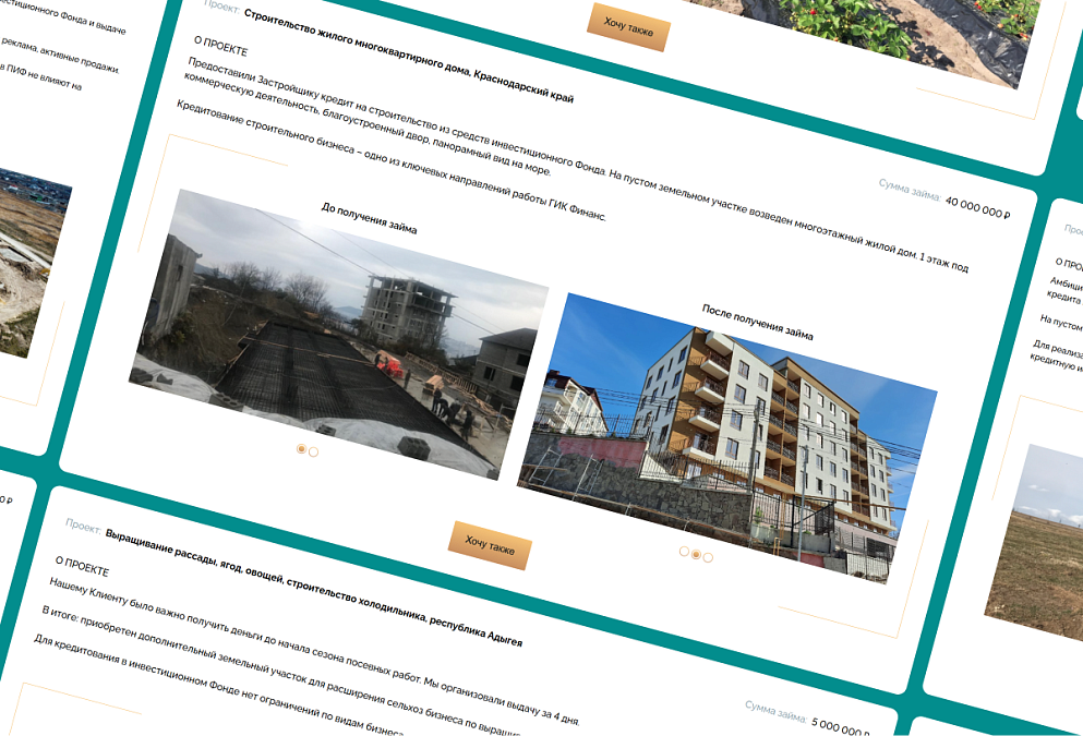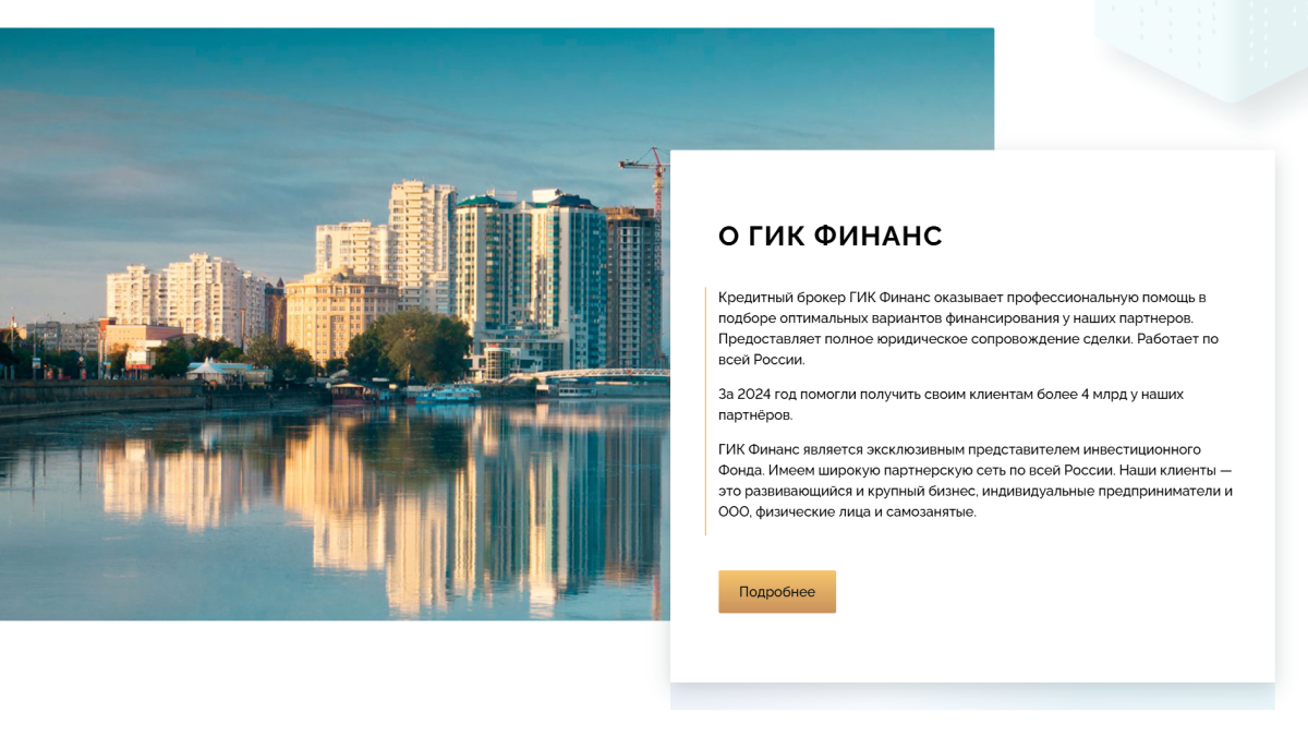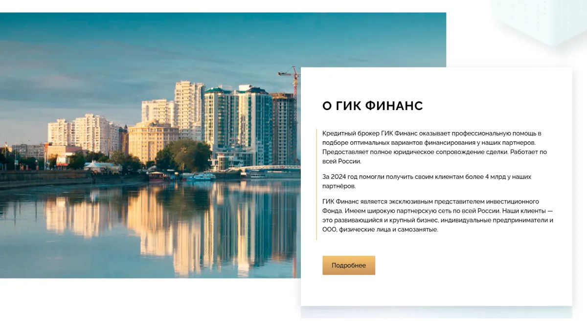 Сайт «ГИК Финанс» демонстрирует не только финансовые условия, но и результаты, которых можно достичь с правильным партнёром. Реальные кейсы показывают, как из пустого участка возникает коттеджный посёлок, а целевые лендинги для брокеров, агентов и инвесторов раскрывают выгоду совместной работы. Страница «О Компании» с сертификатами и вакансиями подкрепляет репутацию серьёзного игрока на рынке, а кредитный калькулятор наглядно показывает стоимость и сроки платежей, делая процесс принятия решений проще и прозрачнее.
