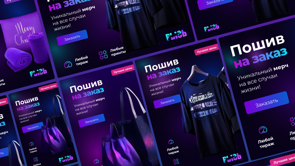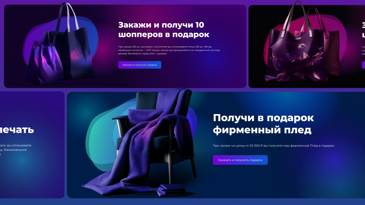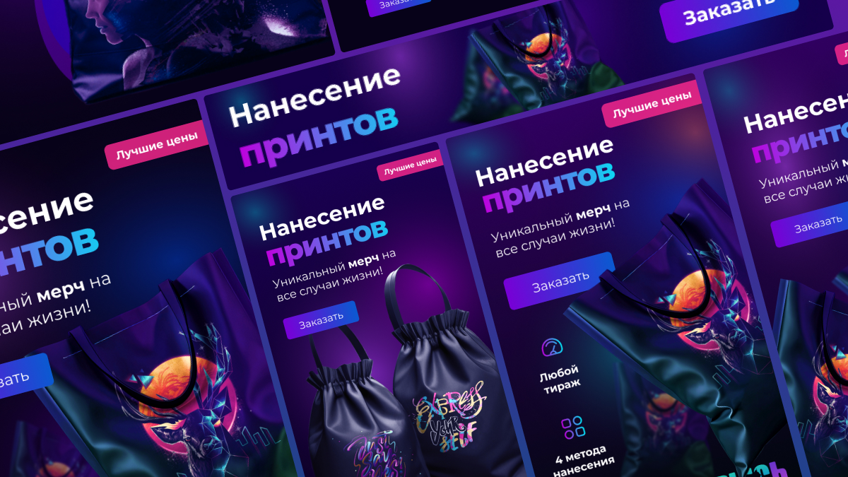 Помимо лендинга, мы разработали визитки, адаптированные под разные типы печати, 45 рекламных баннеров для максимального охвата в Яндекс.Директ и яркие акционные баннеры с оптимизированными SVG-градиентами. Все материалы продуманы до деталей, чтобы они эффективно привлекали внимание, выглядели стильно и выполняли свои задачи.