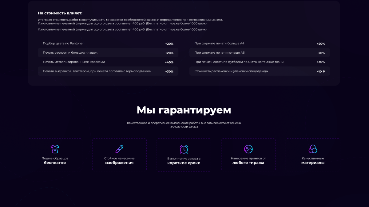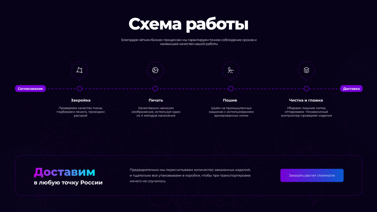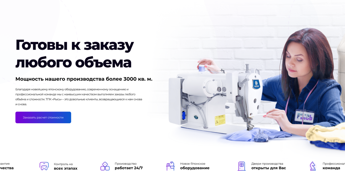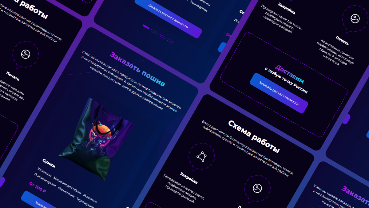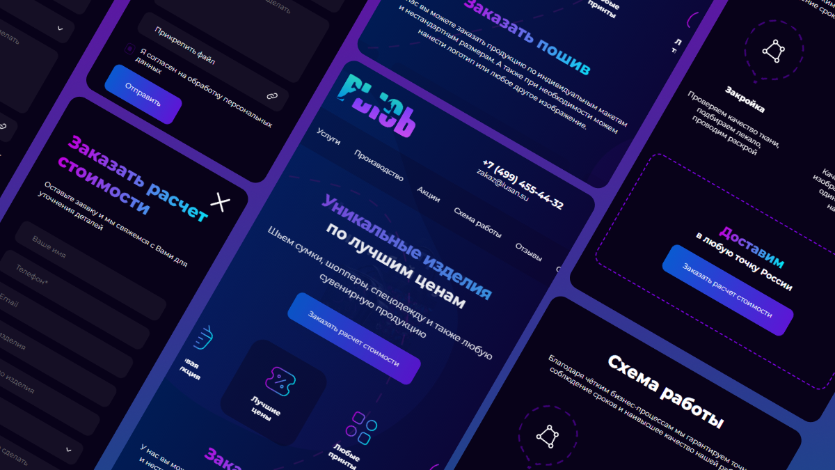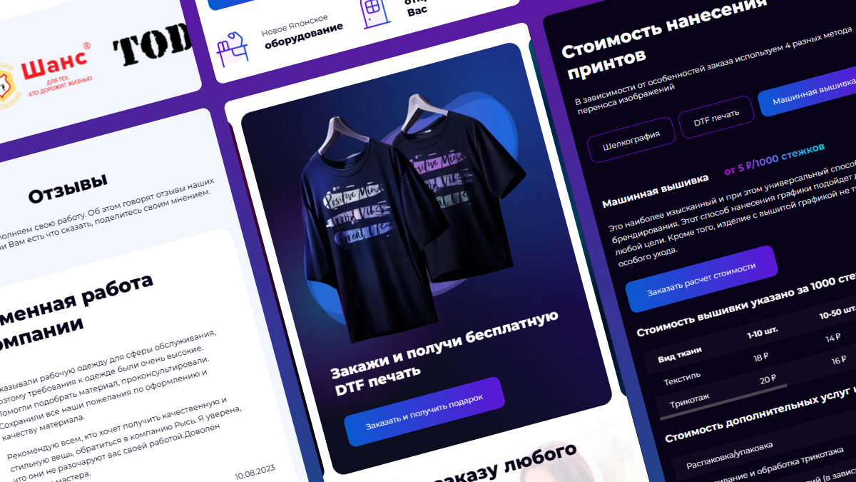 Создали уникальный дизайн, продумали структуру и подачу контента для максимальной конверсии. Использовали нестандартные элементы: анимированные градиенты, фон с эффектом машинной прострочки, мозаичную галерею и динамичные отзывы.