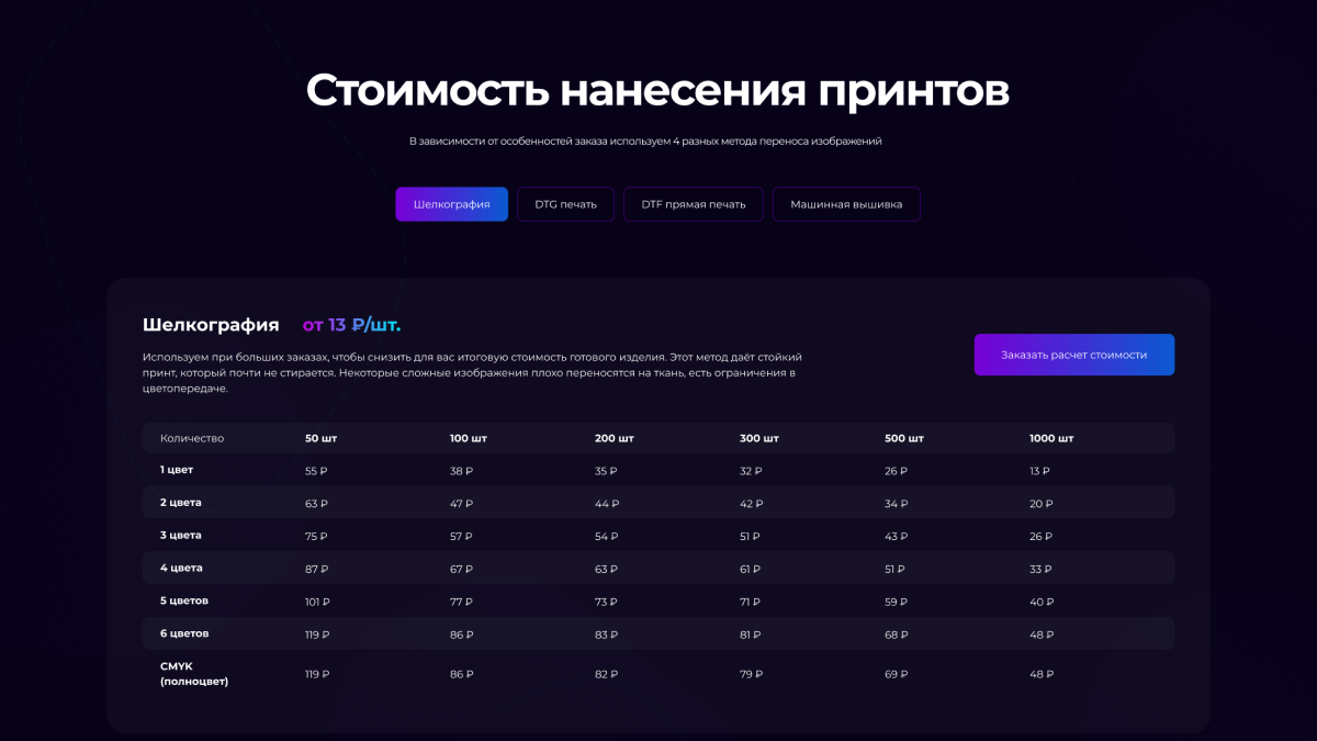 Чёткая структура цен с дополнительной навигацией по разделам.