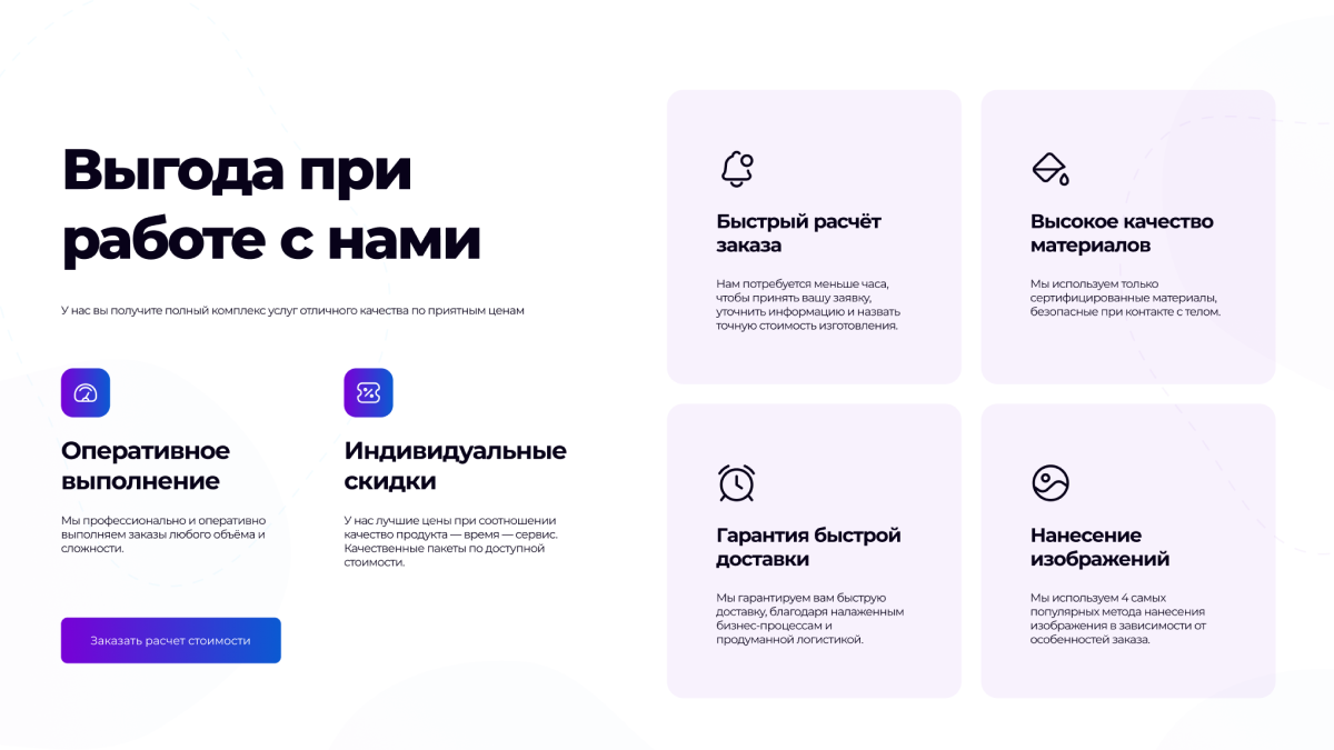 Мы помогли клиенту не просто сделать сайт, а полностью создать и развить новое направление. За 2 месяца мы разработали логотип, фирменный стиль, лендинг, а затем настроили рекламную кампанию, которая начала приносить заявки. Лендинг выполнен в авторском дизайне с высокой конверсией, а уникальное сочетание цветов и интерактивных элементов выделяет бренд среди конкурентов. После запуска клиент начал отказываться от мелких заказов, т.к. производство загружено, штат расширяется, а проект продолжает расти.