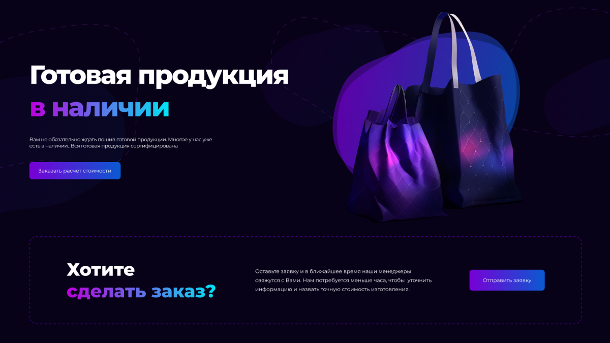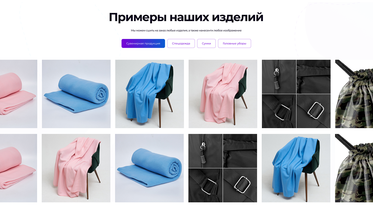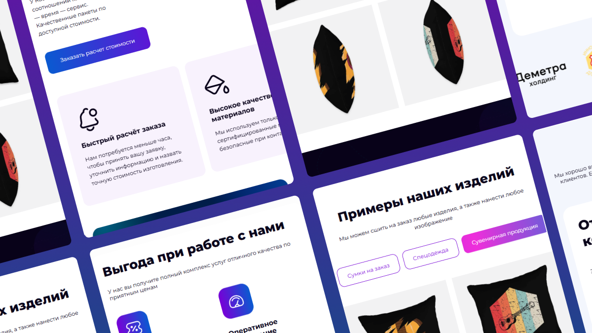 Для мастерской пошива на заказ мы создали более 20 тематических композиций, представив сумки, пледы и текстиль в стильных сетах. Каждая картинка стала не просто иллюстрацией, а элементом портфолио, органично вписанным в дизайн лендинга. Такой подход позволяет сразу оценить мастерство и стиль бренда, превращая сайт в эффектную витрину, которая вдохновляет и убеждает клиентов.
