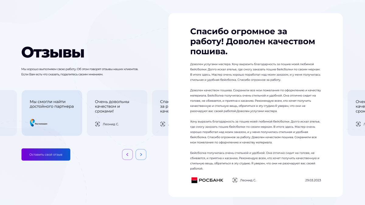 Отзывы оформлены в визуальном стиле благодарственных писем, повышая доверие.