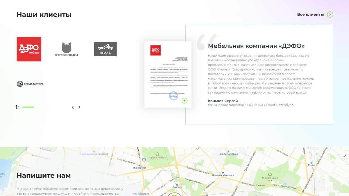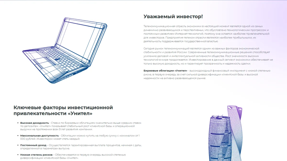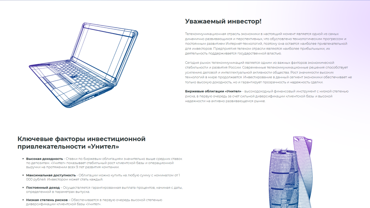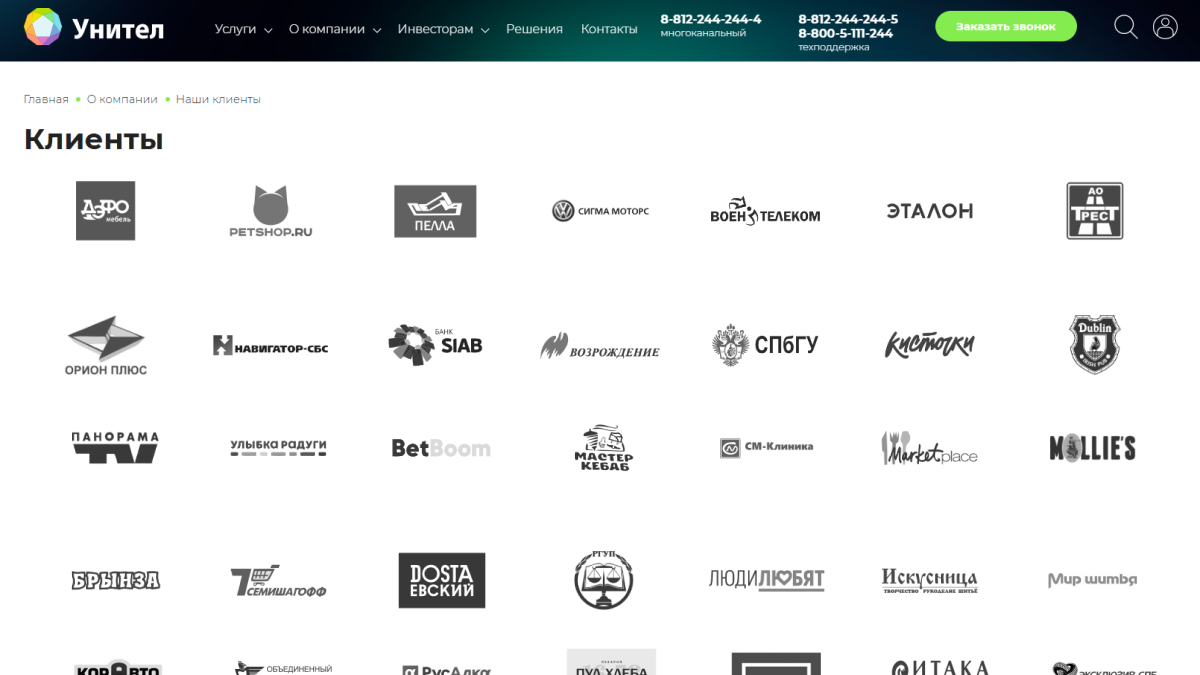 Для Unitelecom мы разработали обширный корпоративный раздел, в котором инвесторы и партнёры без труда находят всю необходимую документацию. Новости и блог оперативно освещают ключевые события, а интерактивный блок с отзывами помогает укрепить доверие. Дополняет картину список клиентов, наглядно подтверждающий масштаб и статус компании. Такой подход объединяет деловую информацию и формирует полное представление о возможностях Unitelecom.