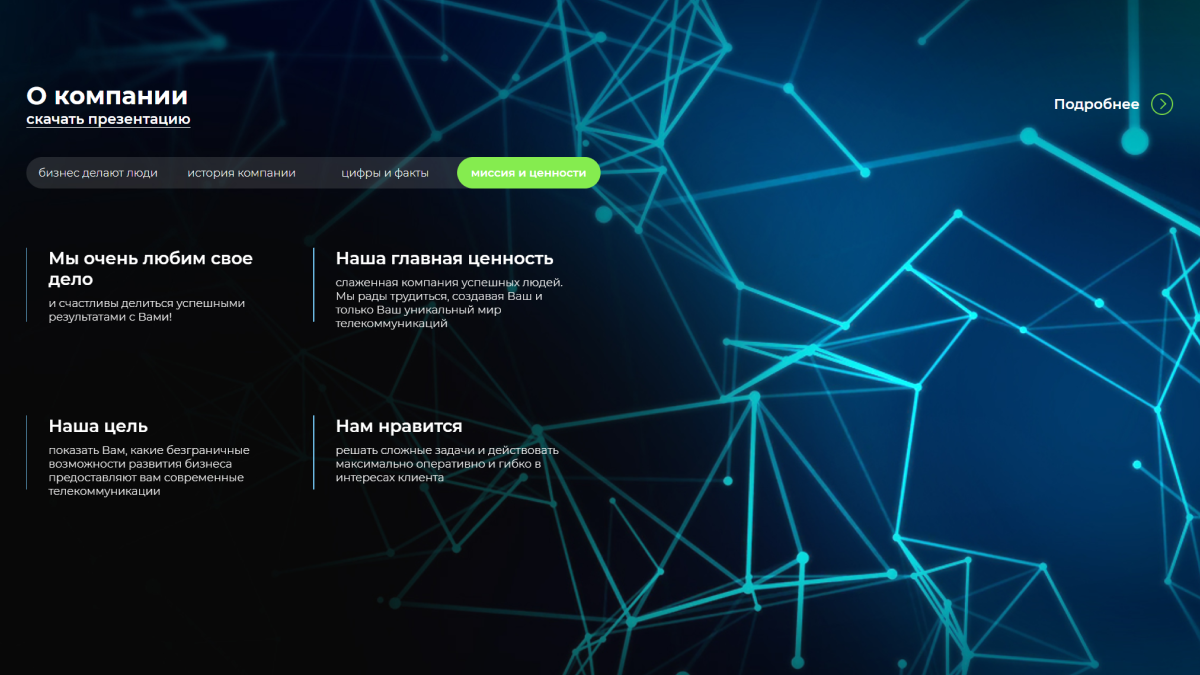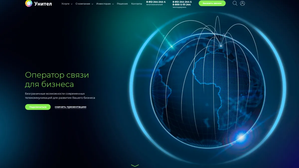 Сайт Unitelecom это цифровое отражение самой сети: единый паттерн связывает анимированные блоки, переходы и навигацию в целостную систему. Динамика и видео передают идею глобальной связи, а каждая услуга на отдельной странице сохраняет общий визуальный язык. Такой подход создает эффект живого, технологичного организма, где пользователь легко ориентируется и сразу видит все возможности оператора.