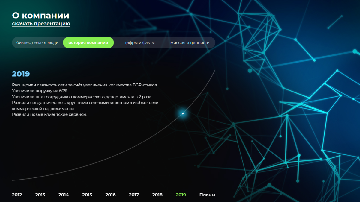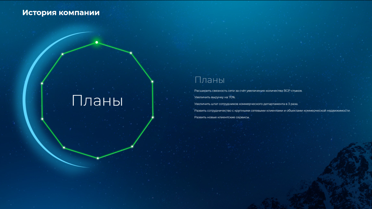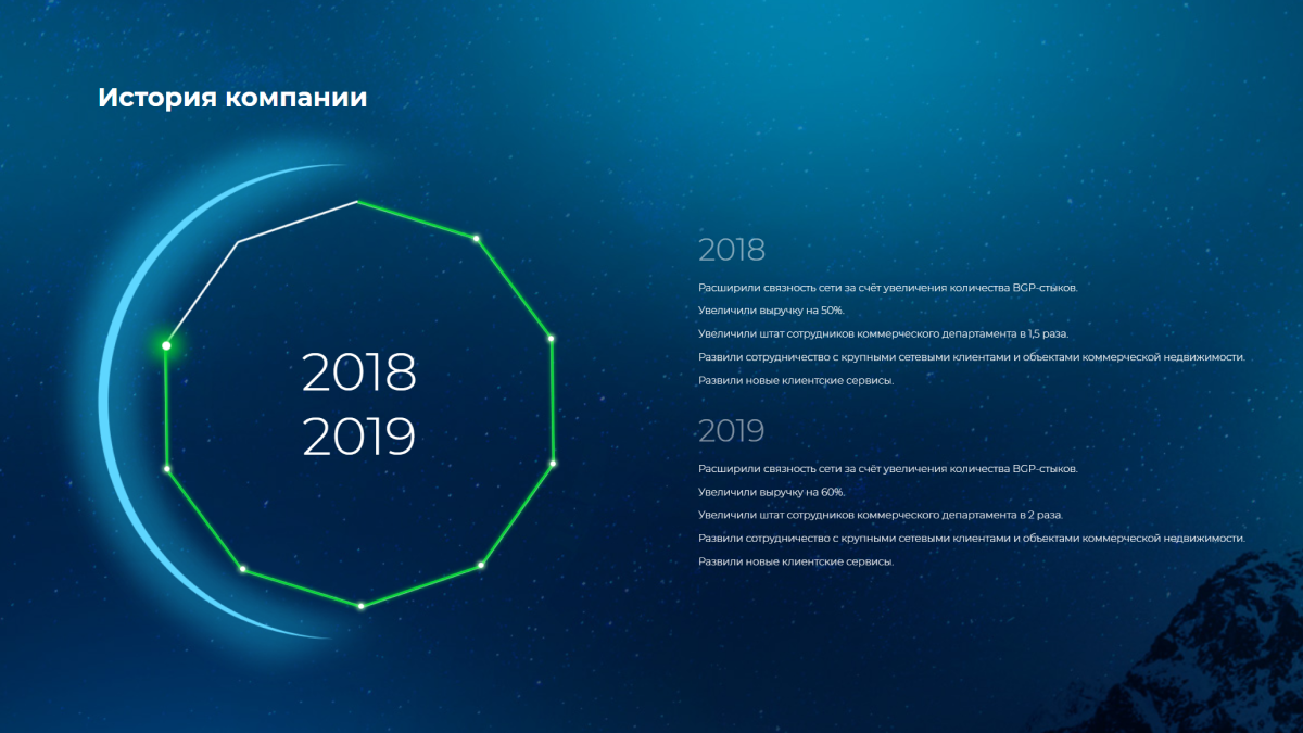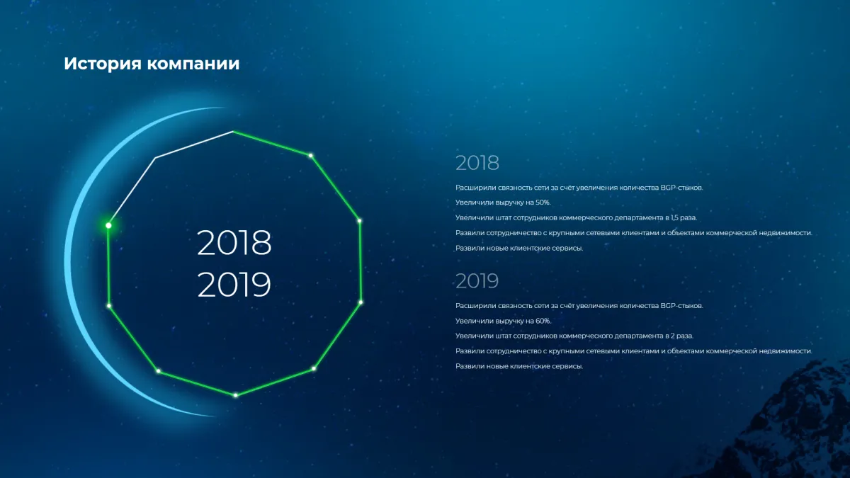 Прокрутка с динамичными переходами, показывающими ключевые этапы развития.