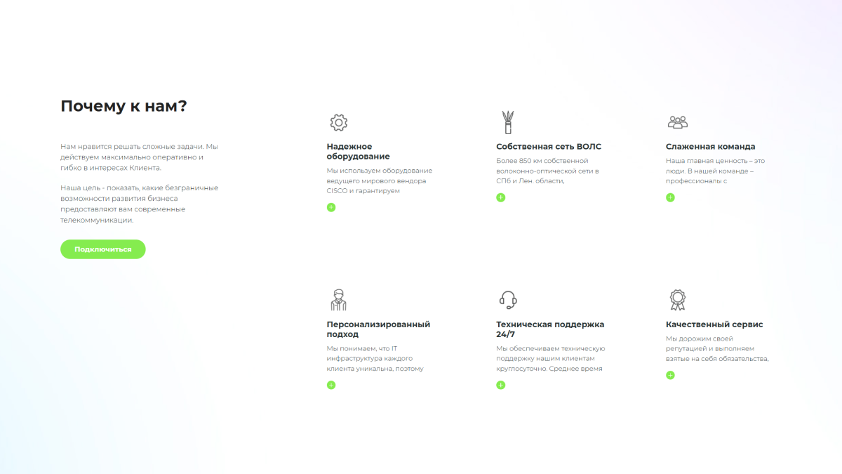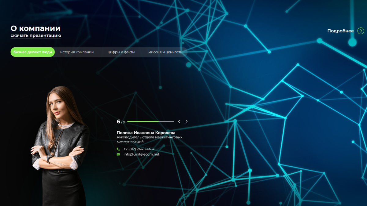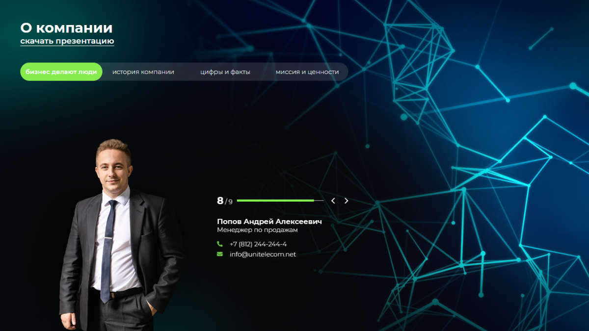 Сайт Unitelecom не только выделяется яркой палитрой, но и удивляет продуманными динамическими элементами. Сочетание видеофонов, интерактивных иконок, анимированных отзывов и эффектной презентации команды формирует образ компании как высокотехнологичного оператора связи, который заботится об удобстве и впечатлении каждого посетителя.