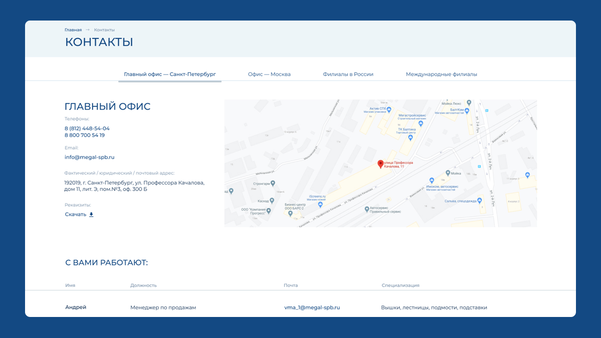 Сложный и многоуровневый каталог продукции Завода MEGAL объединил широкий ассортимент оборудования в удобной и интуитивно понятной структуре. Детализированные карточки товаров содержат всю необходимую информацию, включая характеристики, комплектации и дополнительные опции, обеспечивая клиентам комфортный выбор. Каталог услуг дополняет предложение, подробно описывая каждую услугу и её преимущества. Все каталоги спроектированы с учётом будущего развития сайта, что позволяет легко добавлять новые разделы и обновлять информацию без привязки к разработчику.