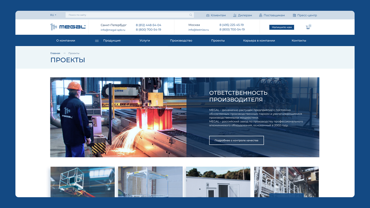 Сайт MEGAL это многофункциональный портал, который сочетает в себе удобство использования, широкий функционал и надёжность. Многоуровневые каталоги, детализированные карточки товаров, продуманные разделы для клиентов и дилеров делают его универсальным решением для бизнеса. Адаптивный дизайн и лёгкость управления обеспечивают актуальность и эффективность сайта на многие годы.